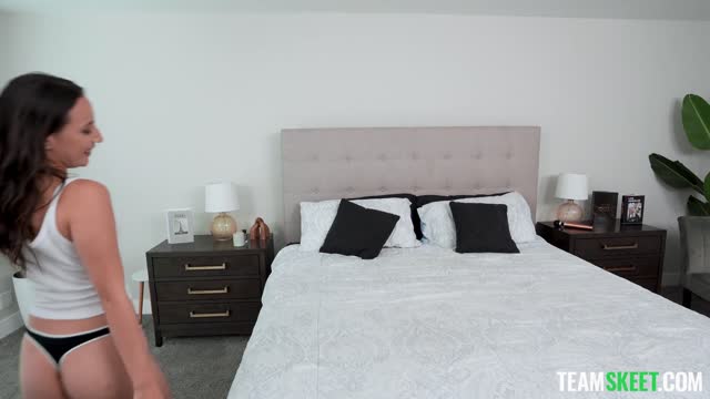 Beautiful, blue-eyed, French Brunet Mia, stares at her boyfriend in bed.
