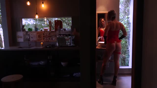 Emilia manages to shoehorn her jugs into a halter top that has no chance of containing them, then she changes into a tight green top and continues her hands-free, side-to-side wiggling. If you're not dizzy by now, you have excellent sea legs.
